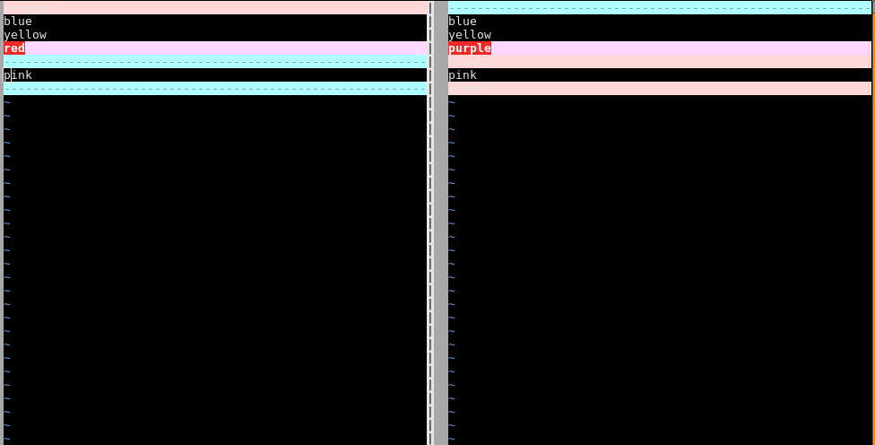 (4c3,4): change 4th line (red) in file1 to 3rd line (purple) and 4th line (black) to match file2