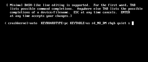 4. Add s at the end of the kernel parameters list (to boot to the single-user mode) and press Enter: