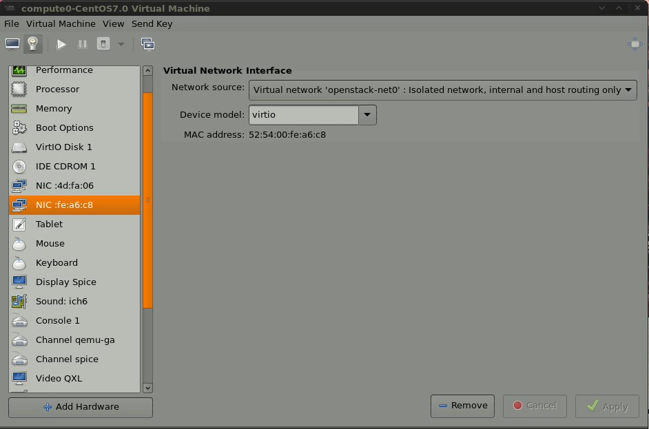Let’s create Virtual Network, which will be used as OpenStack internal network: priv-net. This network is isolated from outside world and its purpose is to provide physical connection (Carrier, ISO/OSI Layer 2: Data Link) between virtual nodes in OpenStack. This network will be attached to 2nd interface (eth1) on each virtual node to provide an exchange of messages (Message Broker: AMQP, QPID) between them. It doesn’t need IP space assignment for OpenStack to work properly, we assigned it IP notification: 192.168.32.0/24 for troubleshooting purpose only, you can assign it any network you want. Along with Virtual Network creation, KVM will create virtual bridge: virbr0.
